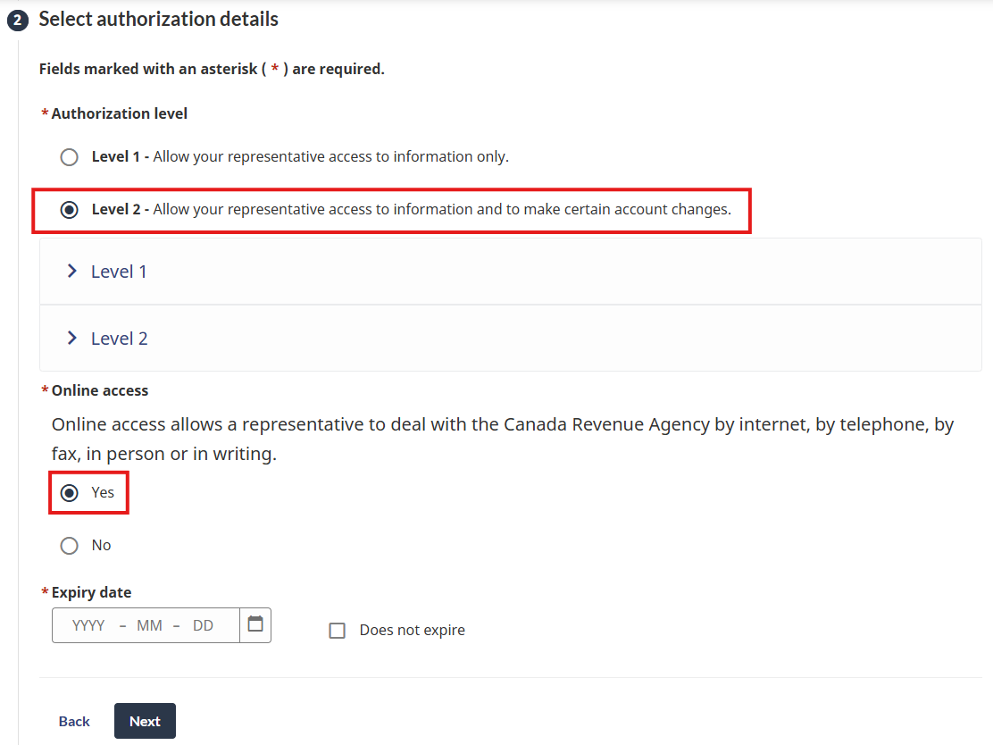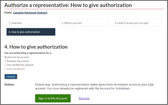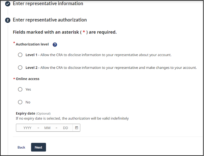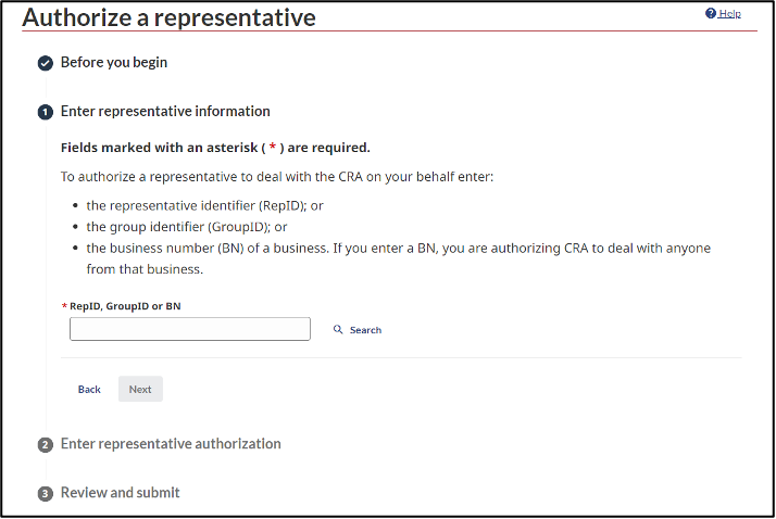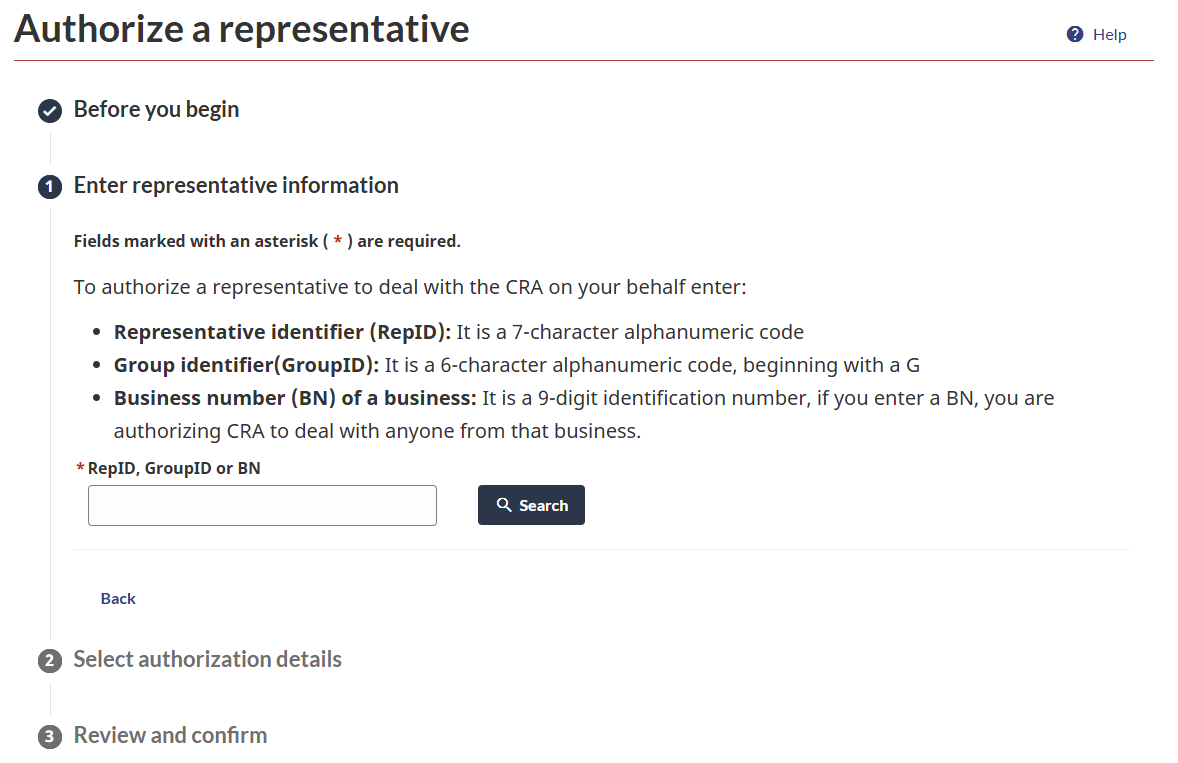 Select the ‘+ Add’ button. From there, select the ‘Start’ button on the next page. You’ll be asked to enter a RepID, GroupID or BN. Once you’ve entered the right ID, click the ‘Search’ button.